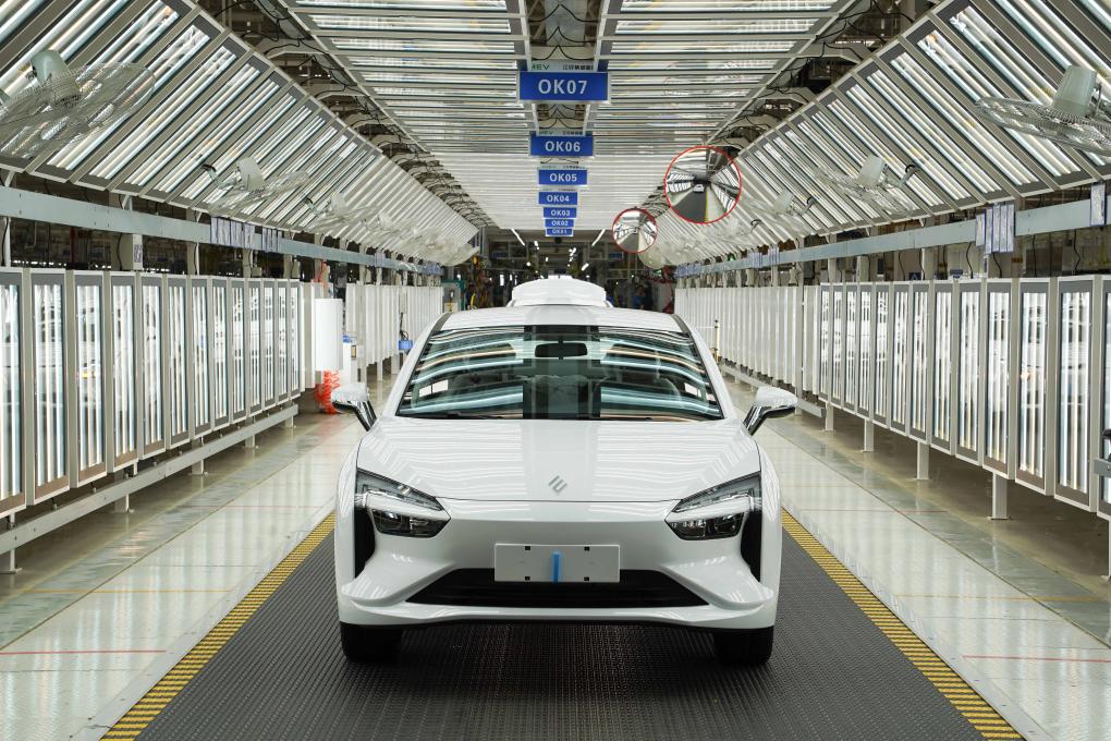 在位于江西省南昌市经开区的江铃集团新能源汽车有限公司生产基地车间内,工人在生产线上作业(2023年7月18日摄)。新华社记者周密摄