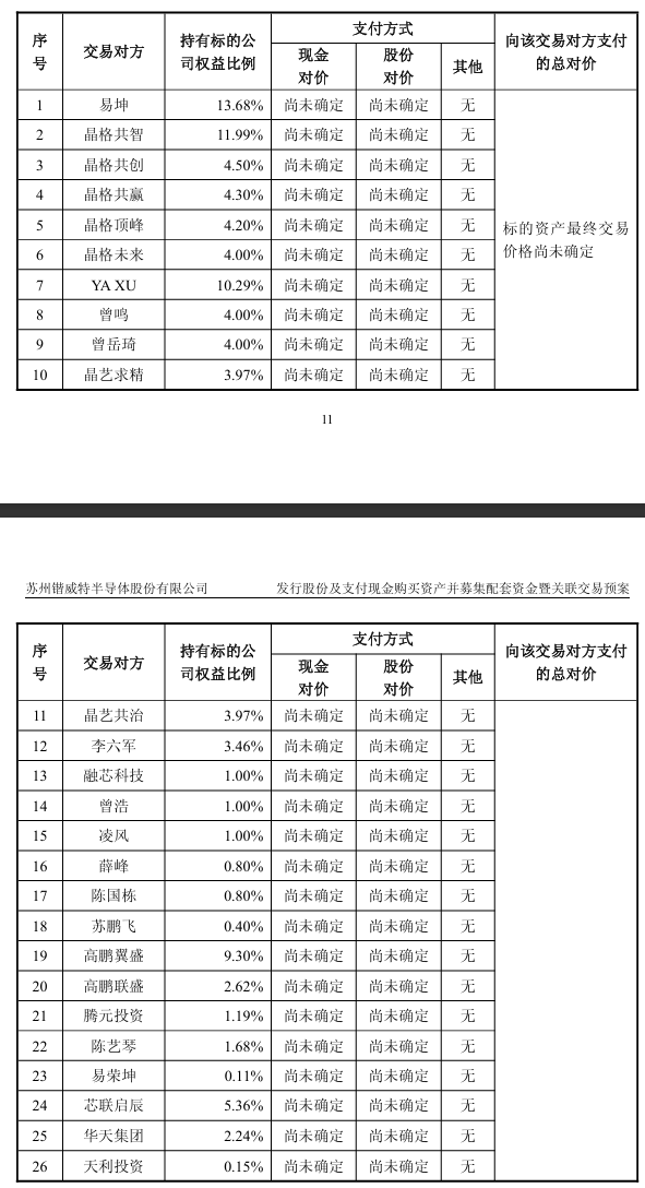 公告显示,锴威特拟通过发行股份及支付现金方式向易坤、晶格共智、晶格共创、晶格共赢、晶格顶峰、晶格未来等26名交易对方购买其合计持有的晶艺半导体100%股份,并募集配套资金。本次交易完成后,晶艺半导体将成为锴威特的全资子公司。