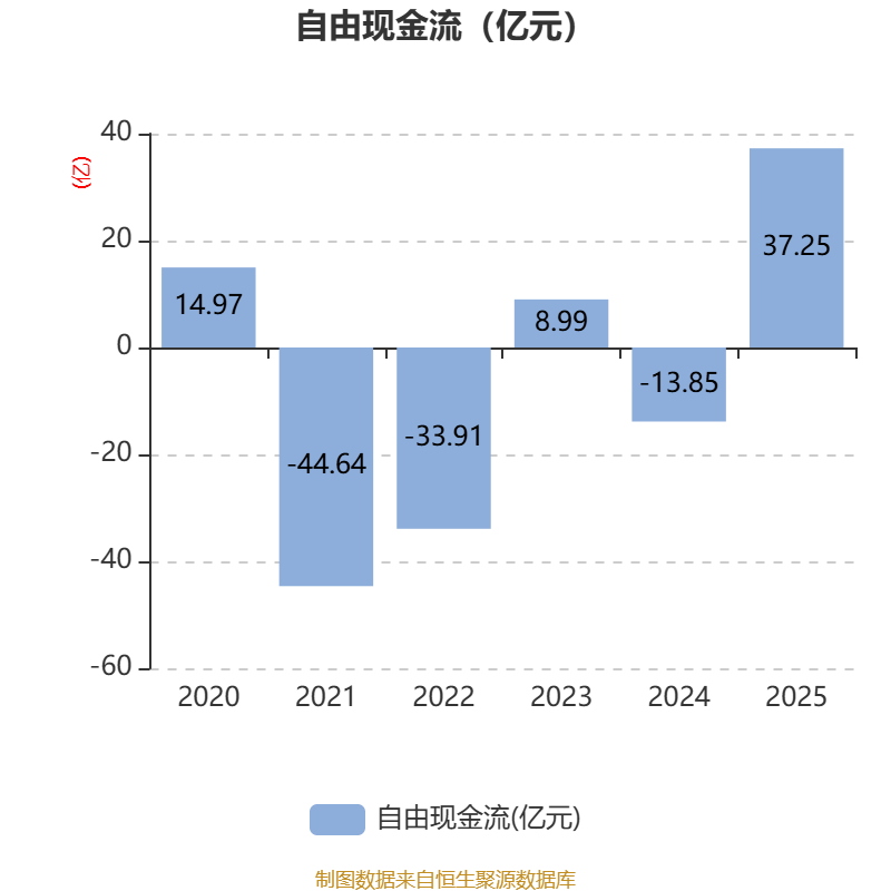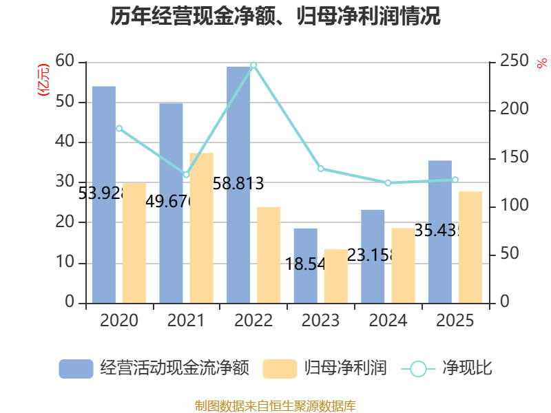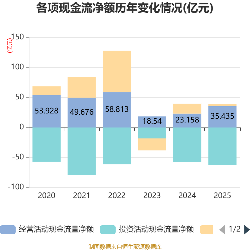截至2025年,公司经营活动现金流净额为35.43亿元,同比增长53.01%;筹资活动现金流净额3.7亿元,同比减少12.81亿元;投资活动现金流净额-62.96亿元,上年同期为-57.24亿元。