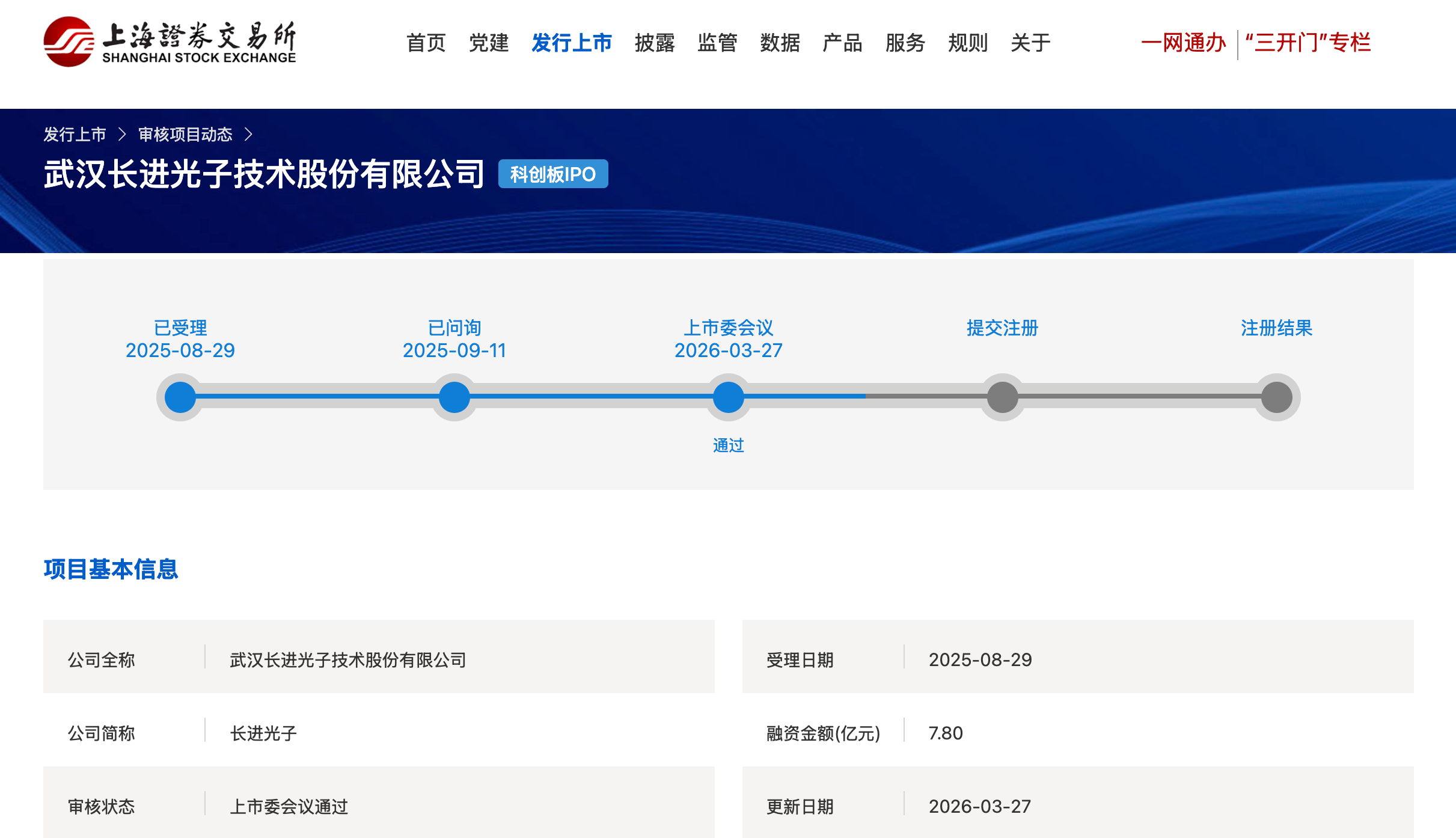 3月27日,上交所官网信息显示,武汉长进光子技术股份有限公司(以下简称“长进光子”)IPO申请通过上交所上市委审议。