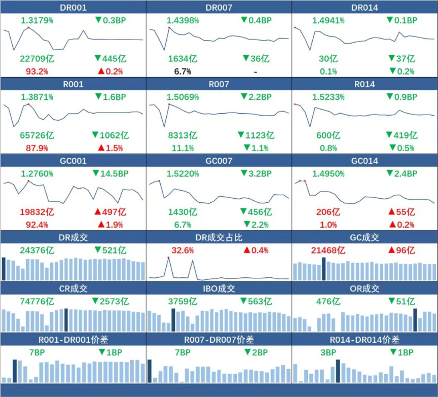 银行间质押式回购市场方面,短期资金量价齐跌。具体看,DR001、R001加权平均利率分别下行0.3BP、1.6BP,分别报1.3179%、1.3871%,成交额分别减少445亿元、1062亿元;DR007、R007加权平均利率分别下行0.4BP、2.2BP,分别报1.4398%、1.5069%,成交额分别减少36亿元、1123亿元;DR014、R014加权平均利率分别下行0.1BP、0.9BP,报1.4941%、1.5233%,成交额分别减少37亿元、419亿元。