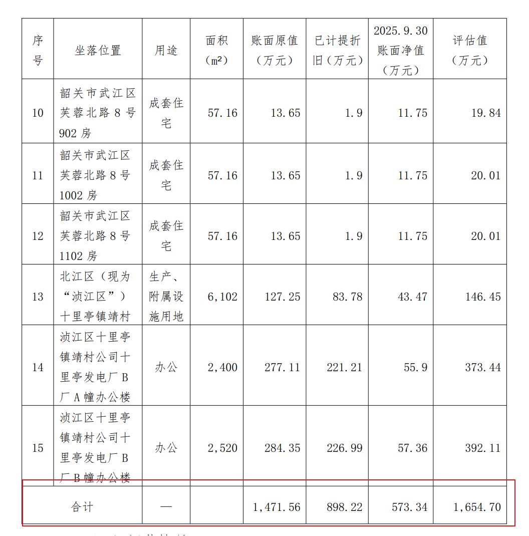事实上,这已不是韶能股份近期首次进行资产盘活。2025年12月5日,该公司曾发布公告,宣布将名下位于韶关市区的15处房产对外公开挂牌转让,评估总价为1654.70万元。