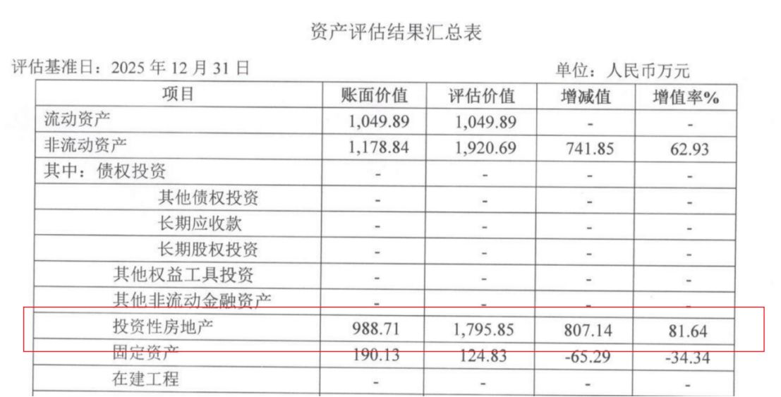 记者从韶能股份同步披露的资产评估报告中查询了解到,评估增值主要来自投资性房地产和非流动负债两个科目。其中,投资性房地产账面价值988.71万元,评估价值达到1795.85万元,增值率81.64%。此外,非流动负债账面价值684.58万元,评估价值0元。