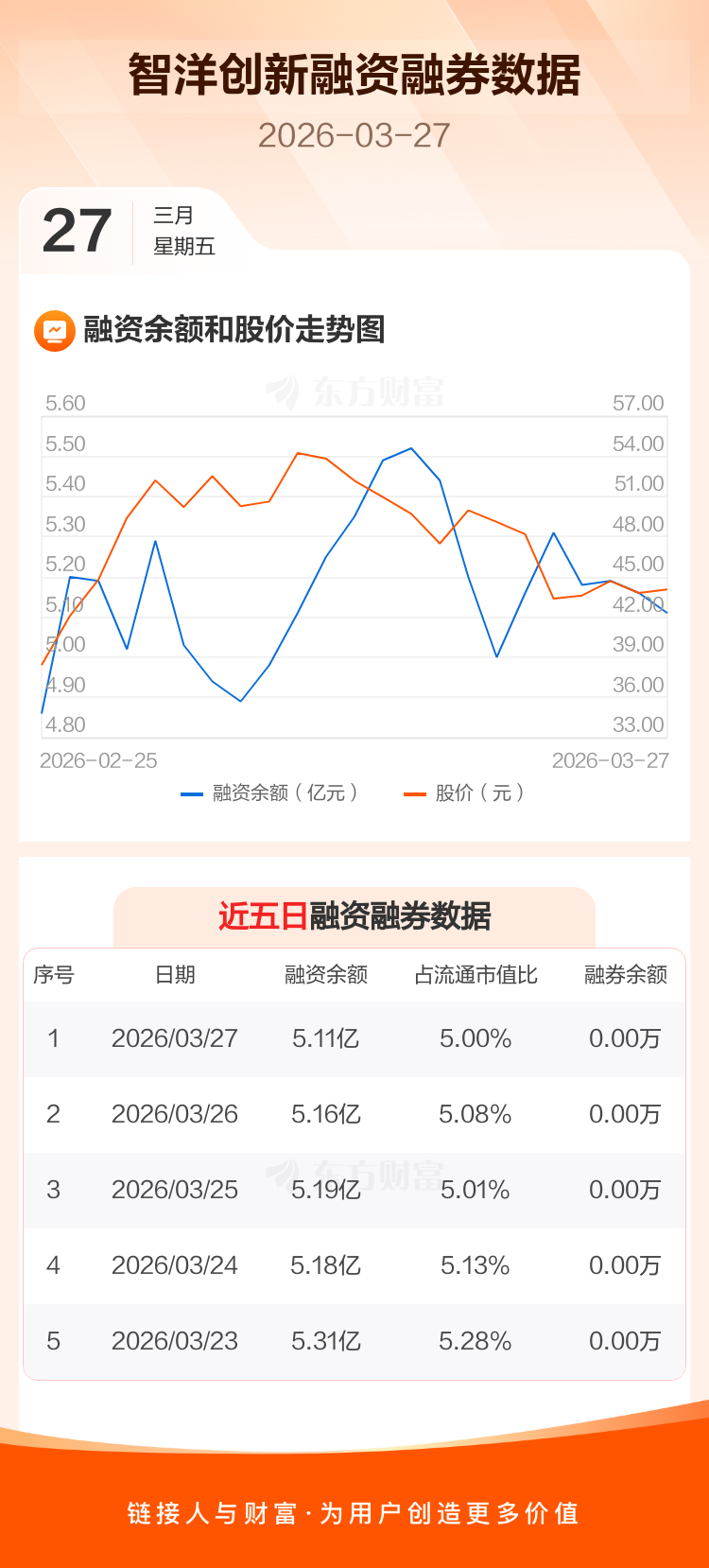 交易所最新数据显示,智洋创新于2026年3月27日获融资买入1669.14万元,融资偿还2171.17万元,当日融资净偿还502.03万元。目前,该股融资余额5.11亿,占流通市值比例为5.00%。