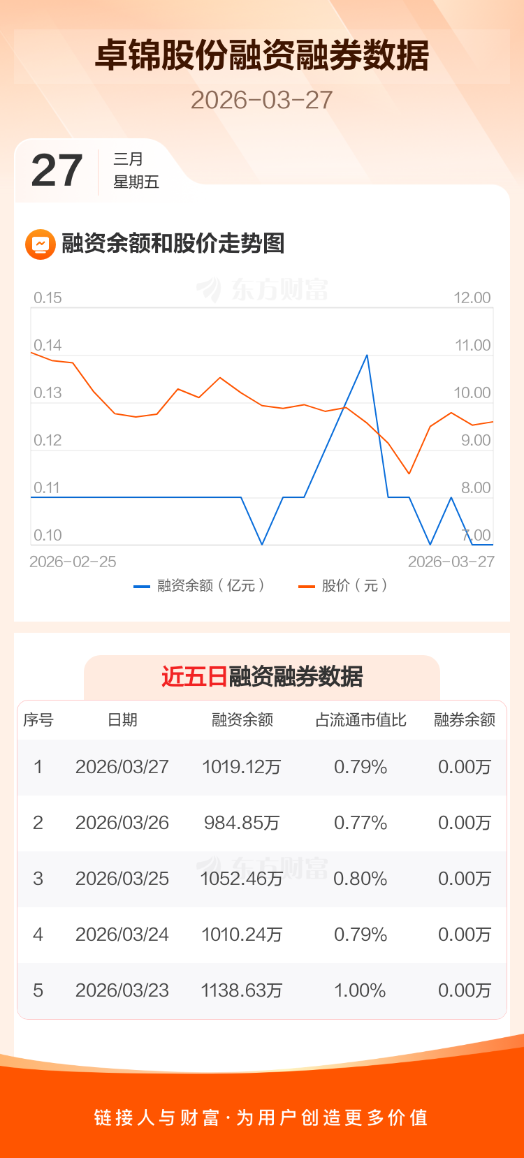 交易所最新数据显示,卓锦股份于2026年3月27日获融资买入142.59万元,融资偿还108.32万元,当日融资净买入34.27万元。目前,该股融资余额1019.12万,占流通市值比例为0.79%。