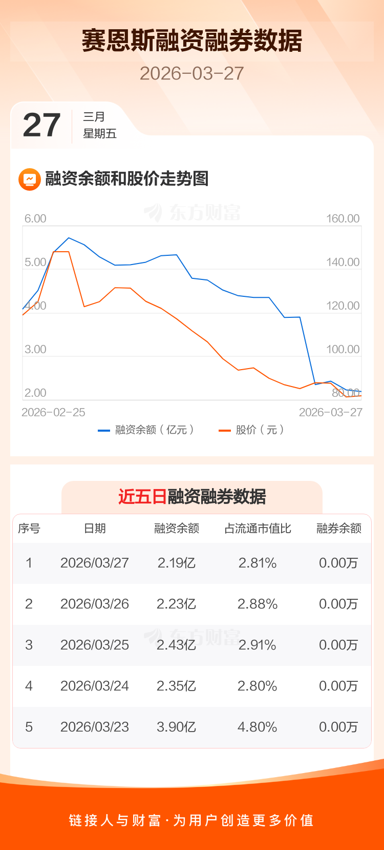 交易所最新数据显示,赛恩斯于2026年3月27日获融资买入2142.86万元,融资偿还2537.06万元,当日融资净偿还394.2万元。目前,该股融资余额2.19亿,占流通市值比例为2.81%。