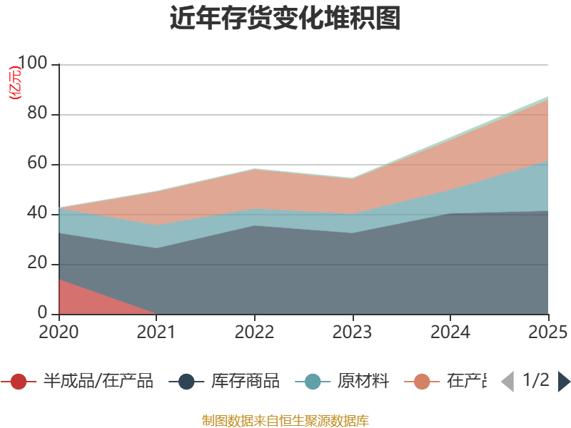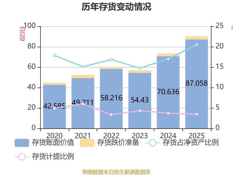 从存货变动来看,截至2025年末,公司存货账面价值为87.06亿元,占净资产的20.49%,较上年末增加16.42亿元。其中,存货跌价准备为3.12亿元,计提比例为3.46%。