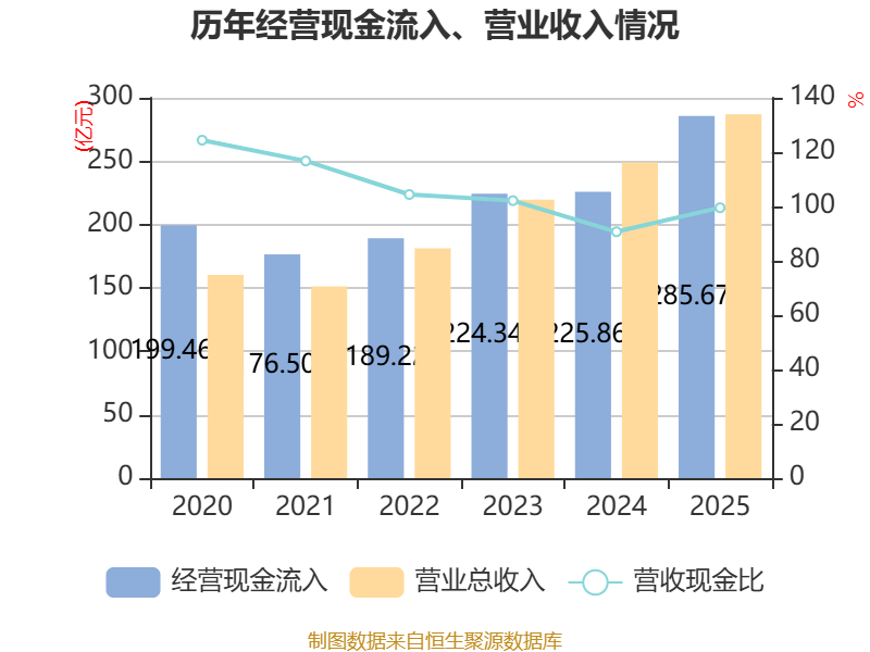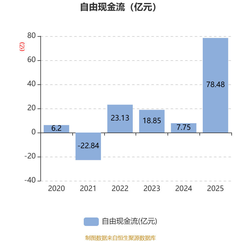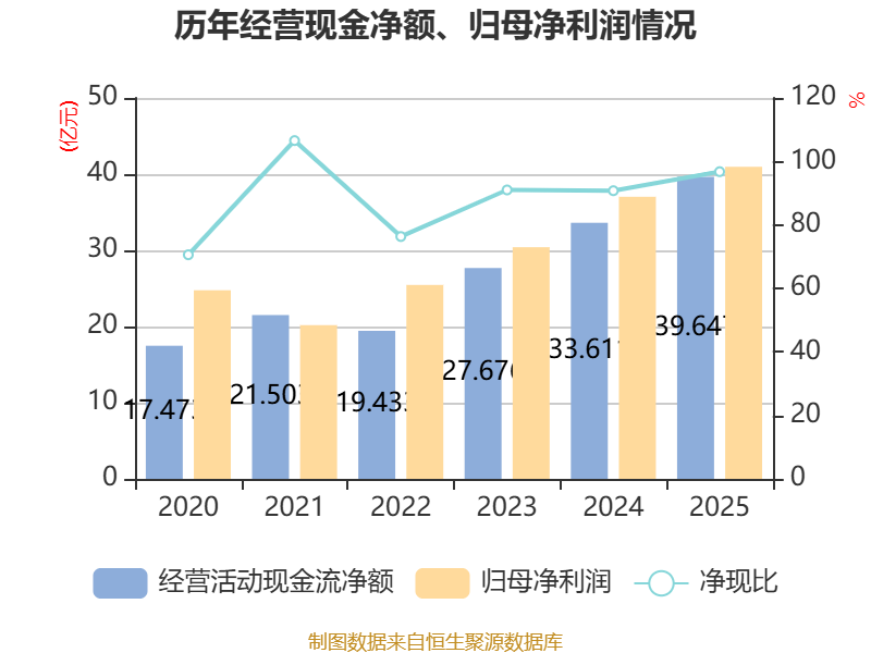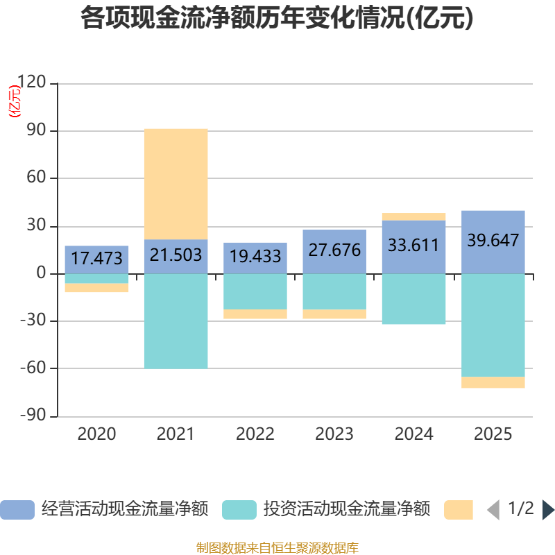 截至2025年,公司经营活动现金流净额为39.65亿元,同比增长17.96%;筹资活动现金流净额-7.03亿元,同比减少11.59亿元;投资活动现金流净额-65.2亿元,上年同期为-32亿元。