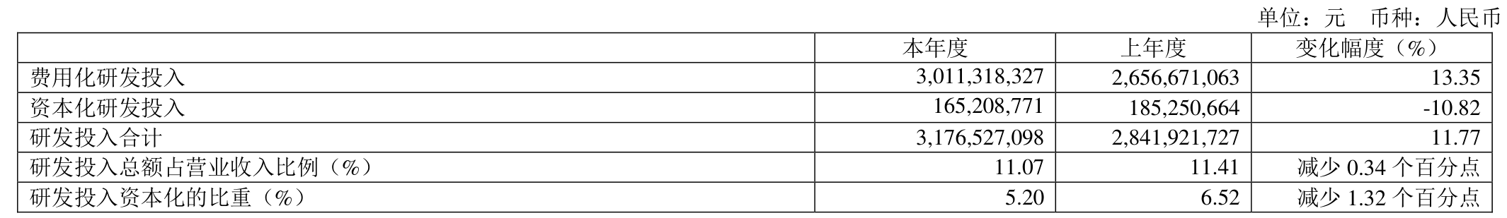2025年全年,公司研发投入金额为31.77亿元,同比增长11.77%;研发投入占营业收入比例为11.07%,相比上年同期下降0.34个百分点。此外,公司全年研发投入资本化率为5.2%。