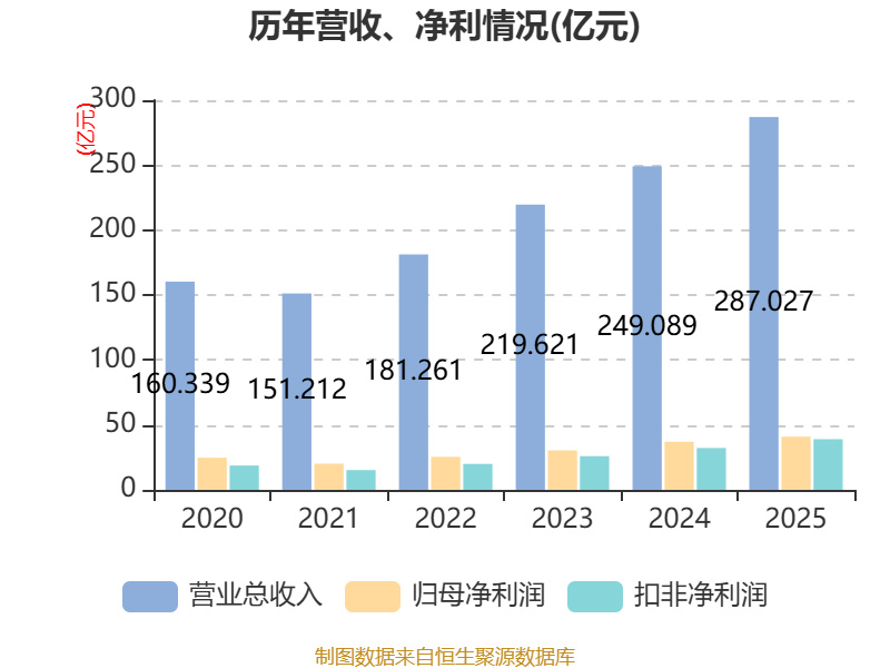中证智能财讯时代电气(688187)3月28日披露2025年年度报告。2025年,公司实现营业总收入287.03亿元,同比增长15.23%;归母净利润40.97亿元,同比增长10.64%;扣非净利润39亿元,同比增长20.91%;经营活动产生的现金流量净额为39.65亿元,同比增长17.96%;报告期内,时代电气基本每股收益为2.99元,加权平均净资产收益率为9.81%。公司2025年度分配预案为:拟向全体股东每10股派现6.8元(含税)。