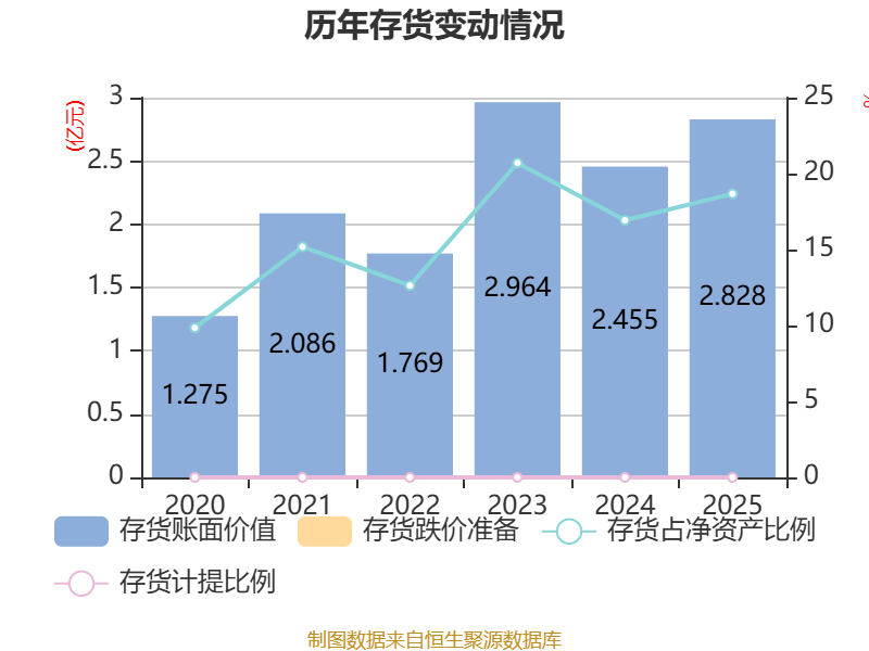 从存货变动来看,截至2025年末,公司存货账面价值为2.83亿元,占净资产的18.67%,较上年末增加3728.64万元。公司本期没有计提存货跌价准备。