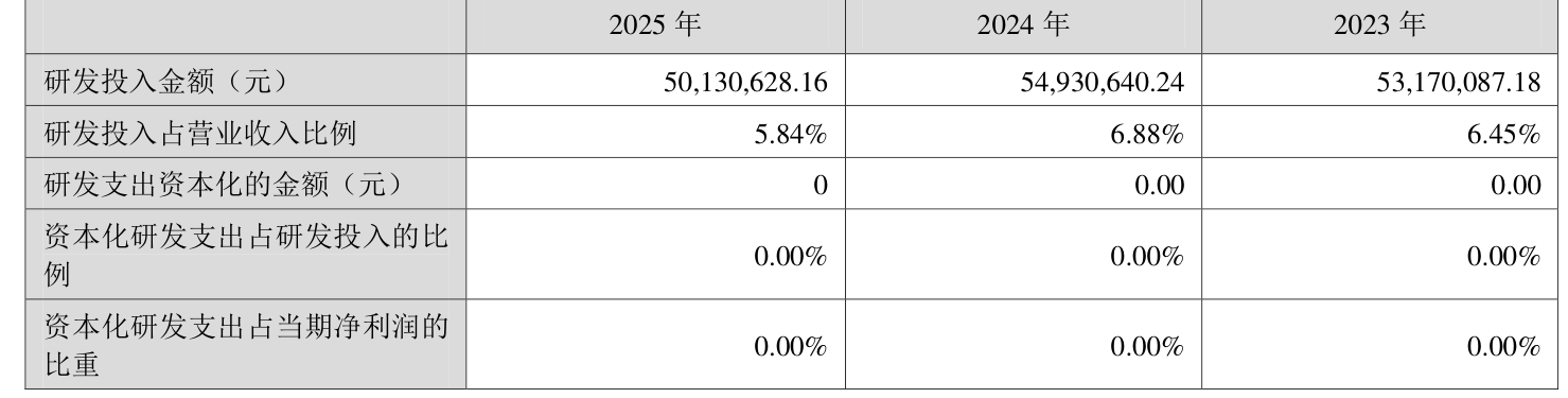 2025年全年,公司研发投入金额为5013.06万元,同比下降8.74%;研发投入占营业收入比例为5.84%,相比上年同期下降1.04个百分点。此外,公司全年研发投入资本化率为0%。