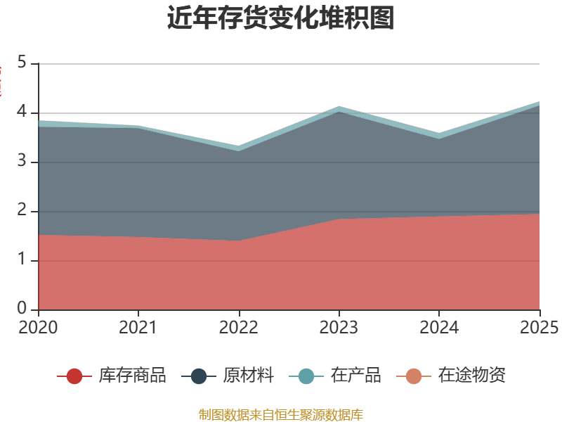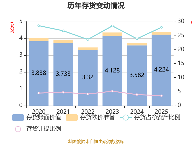 从存货变动来看,截至2025年末,公司存货账面价值为4.22亿元,占净资产的27.95%,较上年末增加6415.41万元。其中,存货跌价准备为1545.39万元,计提比例为3.53%。