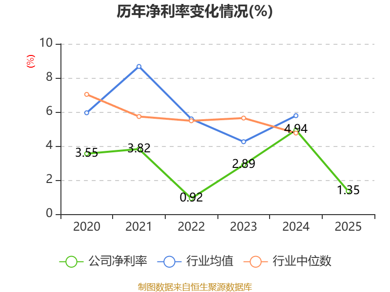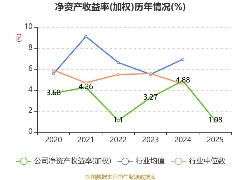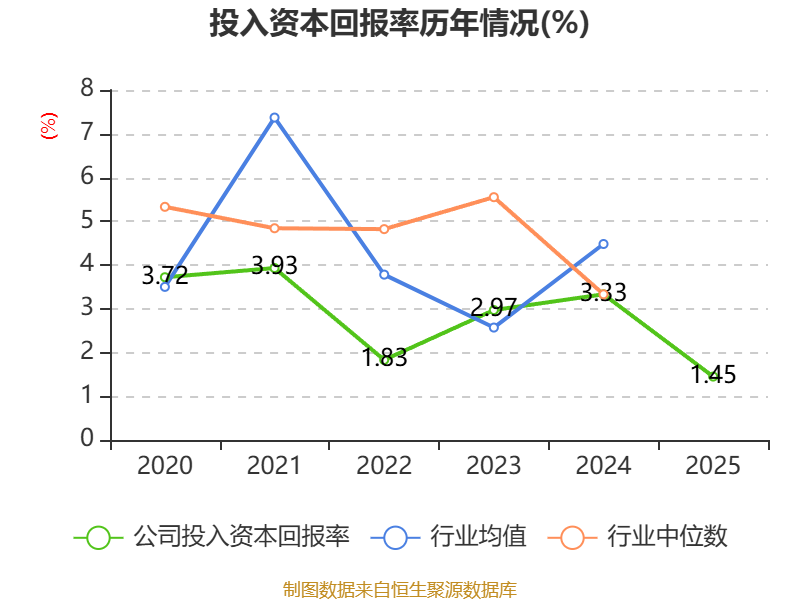 数据显示,2025年公司加权平均净资产收益率为1.08%,较上年同期下降3.8个百分点。公司2025年投入资本回报率为1.45%,较上年同期下降1.88个百分点。