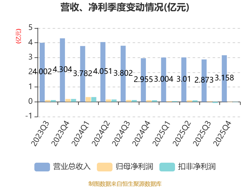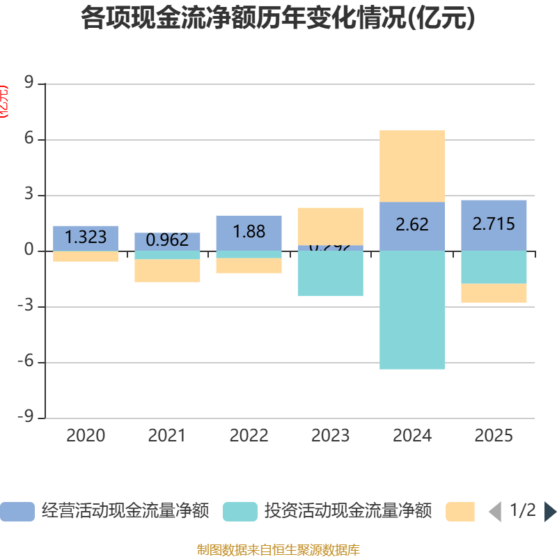 截至2025年,公司经营活动现金流净额为2.72亿元,同比增长3.65%;筹资活动现金流净额-1.02亿元,同比减少4.88亿元;投资活动现金流净额-1.78亿元,上年同期为-6.39亿元。