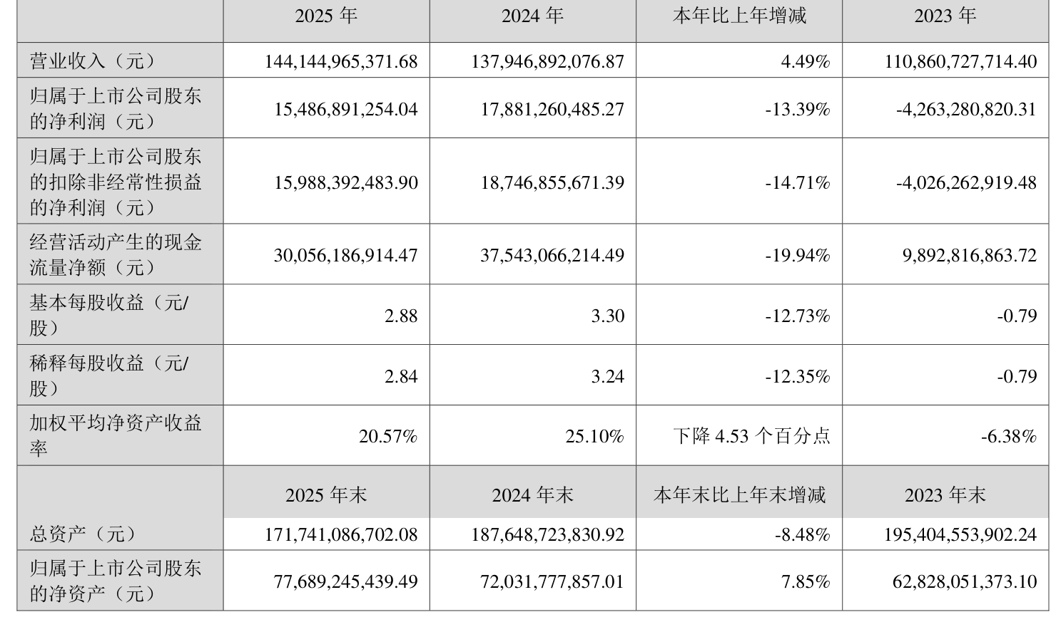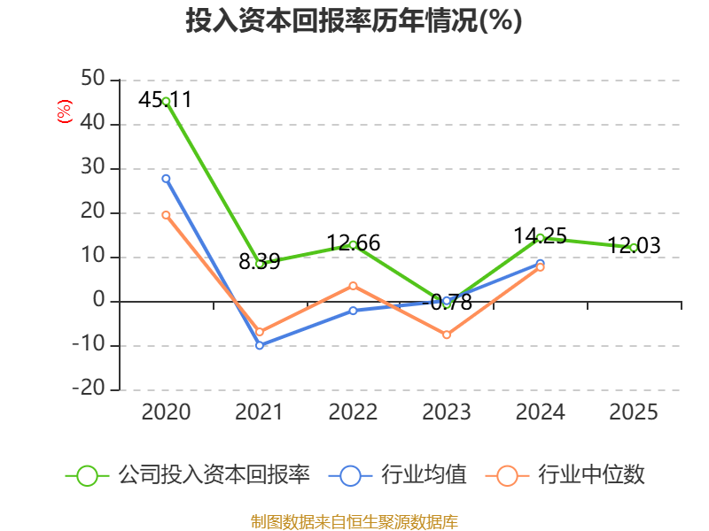 数据显示,2025年公司加权平均净资产收益率为20.57%,较上年同期下降4.53个百分点。公司2025年投入资本回报率为12.03%,较上年同期下降2.22个百分点。