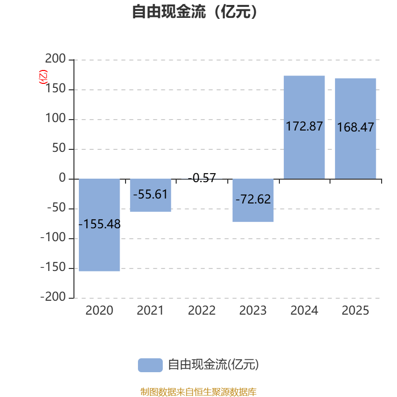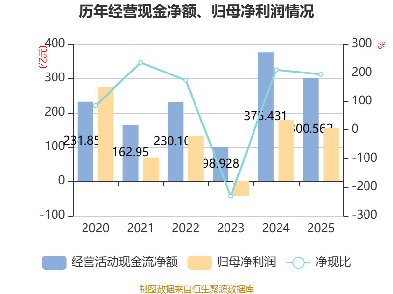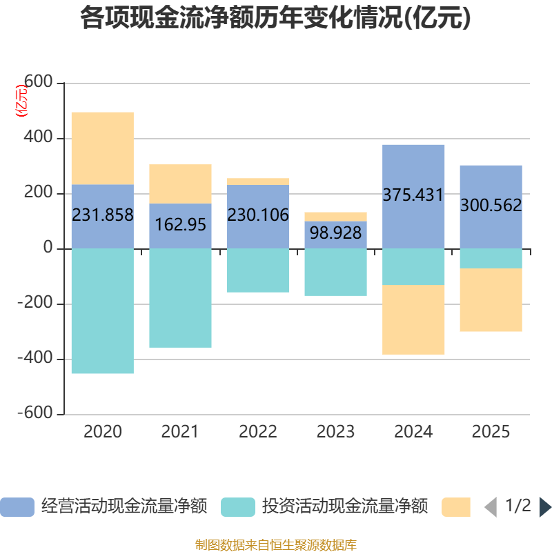截至2025年,公司经营活动现金流净额为300.56亿元,同比下降19.94%;筹资活动现金流净额-228.78亿元,同比增加23.51亿元;投资活动现金流净额-72.45亿元,上年同期为-132.46亿元。