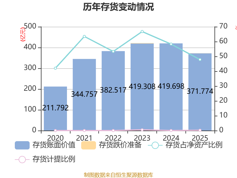 从存货变动来看,截至2025年末,公司存货账面价值为371.77亿元,占净资产的47.85%,较上年末减少47.92亿元。其中,存货跌价准备为6942.6万元,计提比例为0.19%。