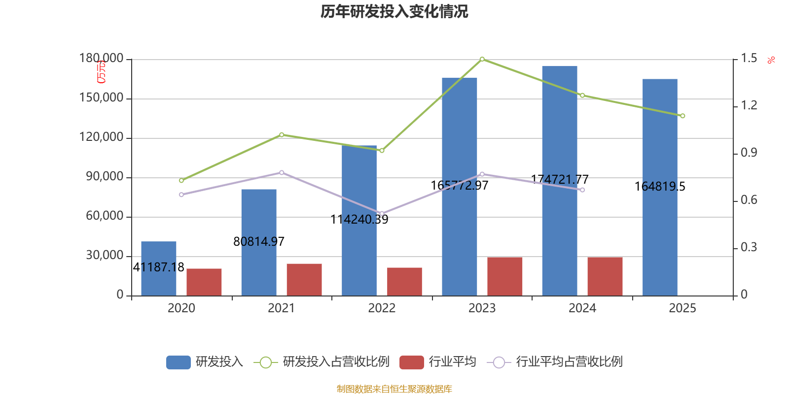 2025年全年,公司研发投入金额为16.48亿元,同比下降5.67%;研发投入占营业收入比例为1.14%,相比上年同期下降0.13个百分点。此外,公司全年研发投入资本化率为0%。