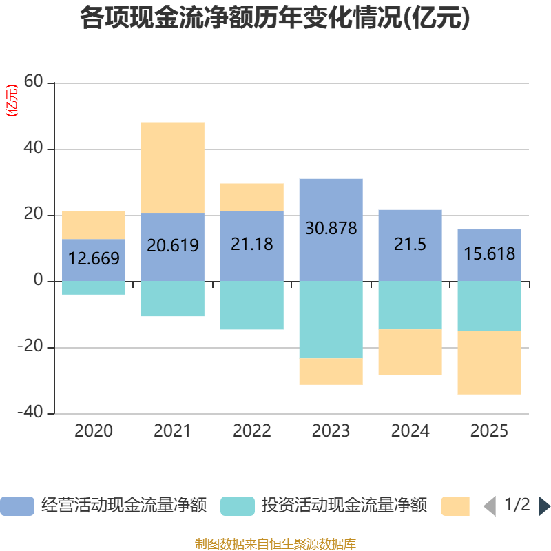截至2025年,公司经营活动现金流净额为15.62亿元,同比下降27.36%;筹资活动现金流净额-19.16亿元,同比减少5.3亿元;投资活动现金流净额-15.16亿元,上年同期为-14.62亿元。