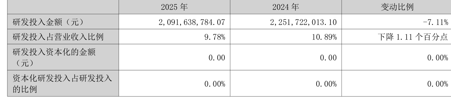 2025年全年,公司研发投入金额为20.92亿元,同比下降7.11%;研发投入占营业收入比例为9.78%,相比上年同期下降1.11个百分点。此外,公司全年研发投入资本化率为0%。