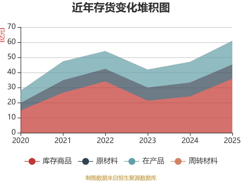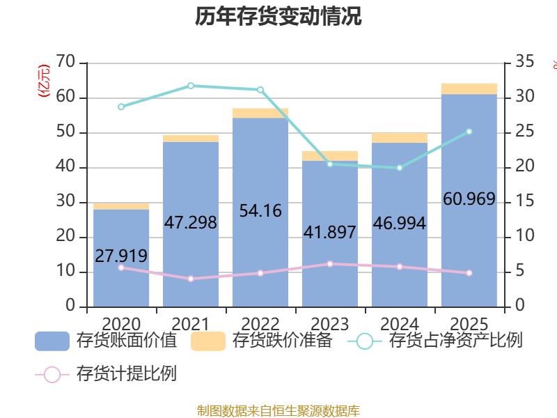 从存货变动来看,截至2025年末,公司存货账面价值为60.97亿元,占净资产的25.12%,较上年末增加13.98亿元。其中,存货跌价准备为3.09亿元,计提比例为4.82%。
