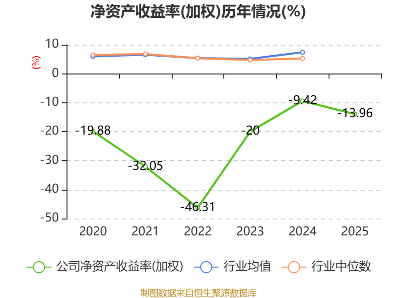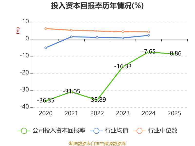 数据显示,2025年公司加权平均净资产收益率为-13.96%,较上年同期下降4.54个百分点。公司2025年投入资本回报率为-8.86%,较上年同期下降1.21个百分点。
