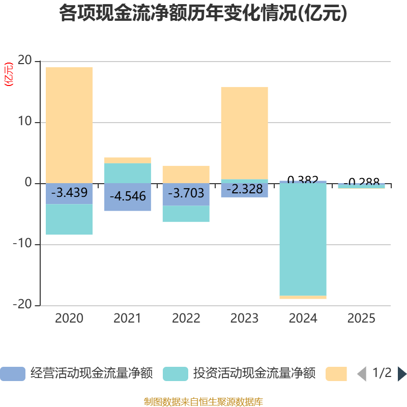截至2025年,公司经营活动现金流净额为-2878.2万元,同比减少6698.65万元;筹资活动现金流净额-750.1万元,同比增加4381.54万元;投资活动现金流净额-5563.44万元,上年同期为-18.45亿元。