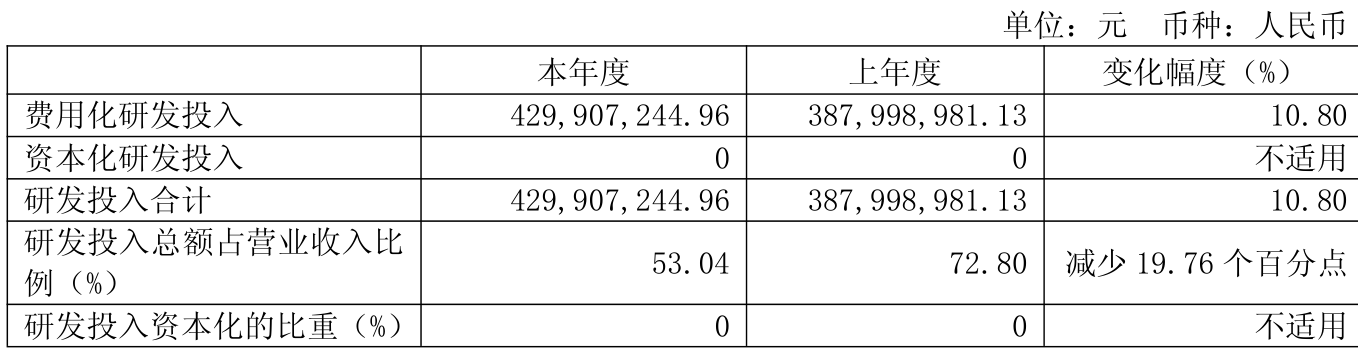 2025年全年,公司研发投入金额为4.3亿元,同比增长10.8%;研发投入占营业收入比例为53.04%,相比上年同期下降19.76个百分点。此外,公司全年研发投入资本化率为0%。