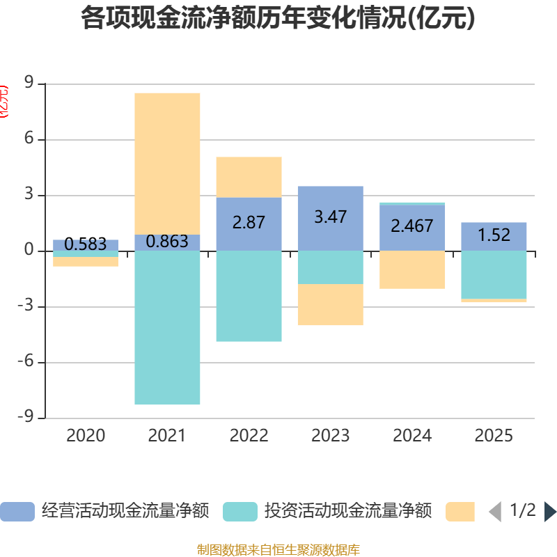 截至2025年,公司经营活动现金流净额为1.52亿元,同比下降38.41%;筹资活动现金流净额-1703.56万元,同比增加1.88亿元;投资活动现金流净额-2.61亿元,上年同期为1228.06万元。