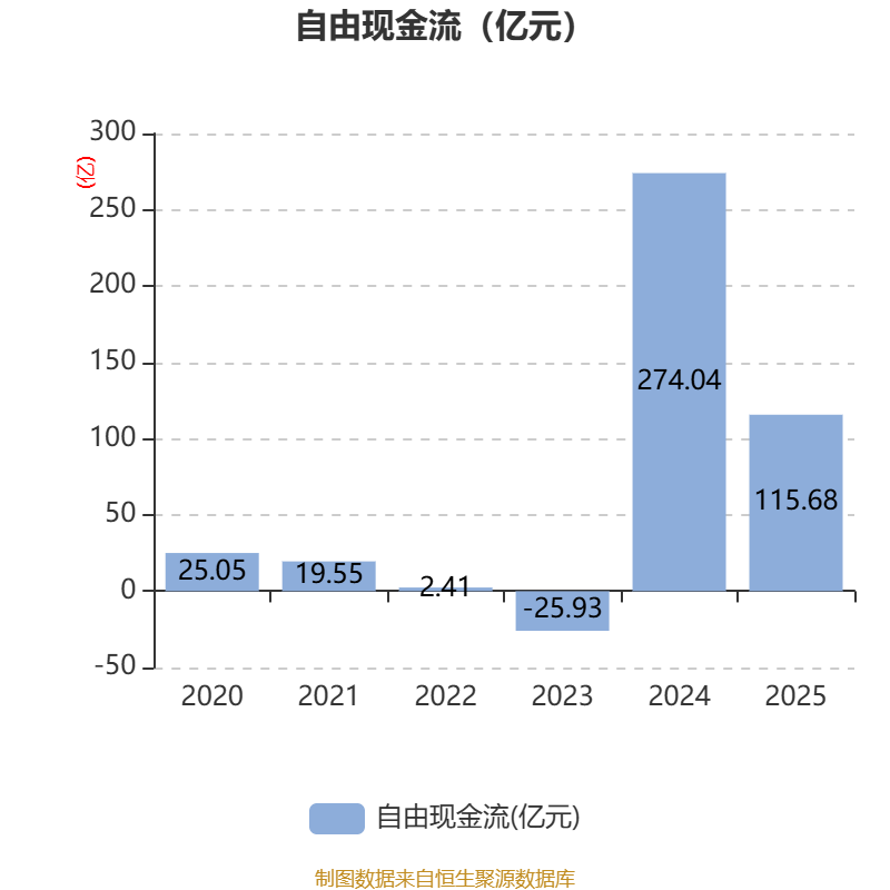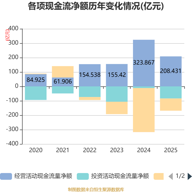 截至2025年,公司经营活动现金流净额为208.43亿元,同比下降35.64%;筹资活动现金流净额-84.97亿元,同比增加220.75亿元;投资活动现金流净额-83.77亿元,上年同期为-11.6亿元。