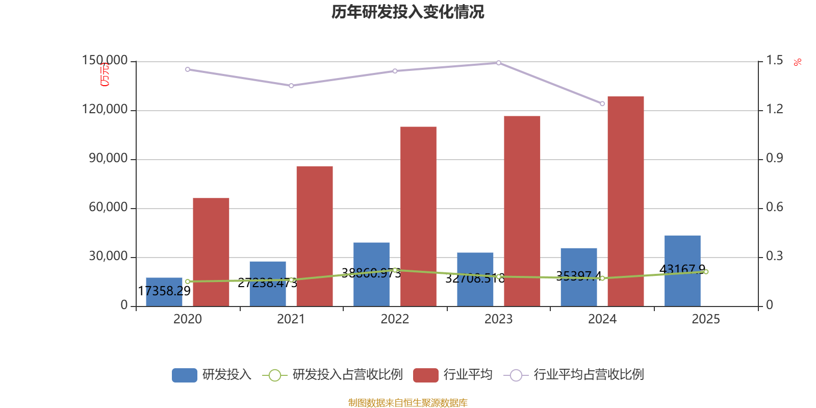 2025年全年,公司研发投入金额为4.32亿元,同比增长21.95%;研发投入占营业收入比例为0.21%,相比上年同期上升0.04个百分点。此外,公司全年研发投入资本化率为0%。