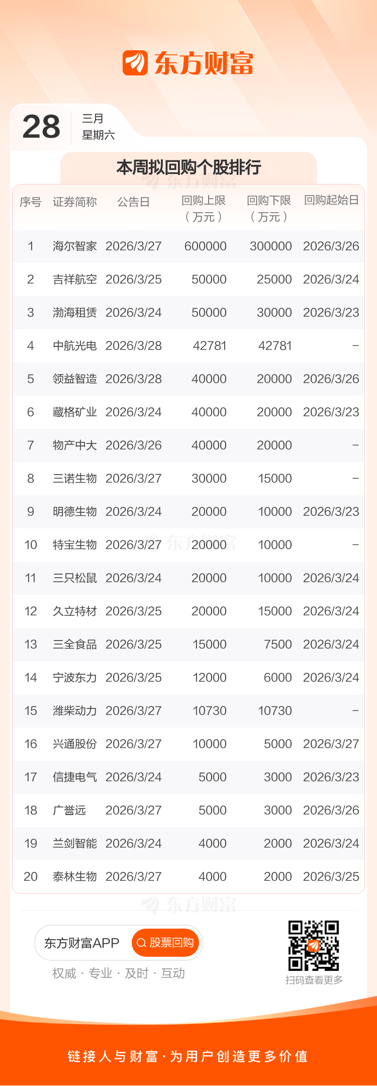 本周有46家公司宣布回购计划,按拟回购金额上限统计,计划回购金额103.85亿元。其中海尔智家拟回购金额上限最高,为60.00亿元。