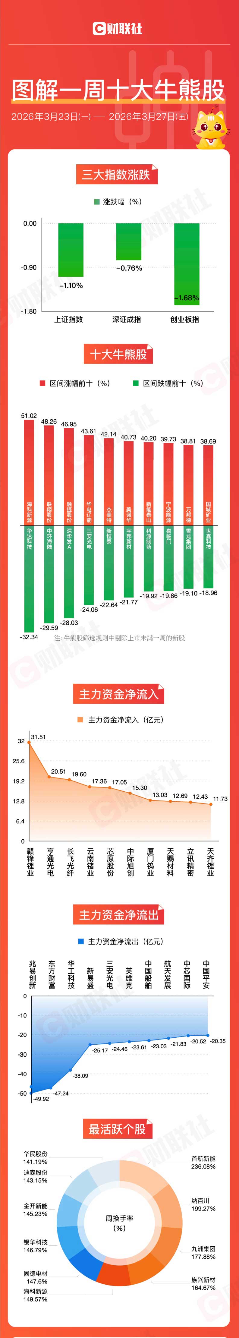 财联社3月28日讯,本周A股三大指数震荡回调,其中上证指数周跌1.10%,深成指周跌0.76%,创业板指周跌1.68%。本周绿色电力、电池板块涨幅居前,能源金属、兵装重组概念股表现活跃。