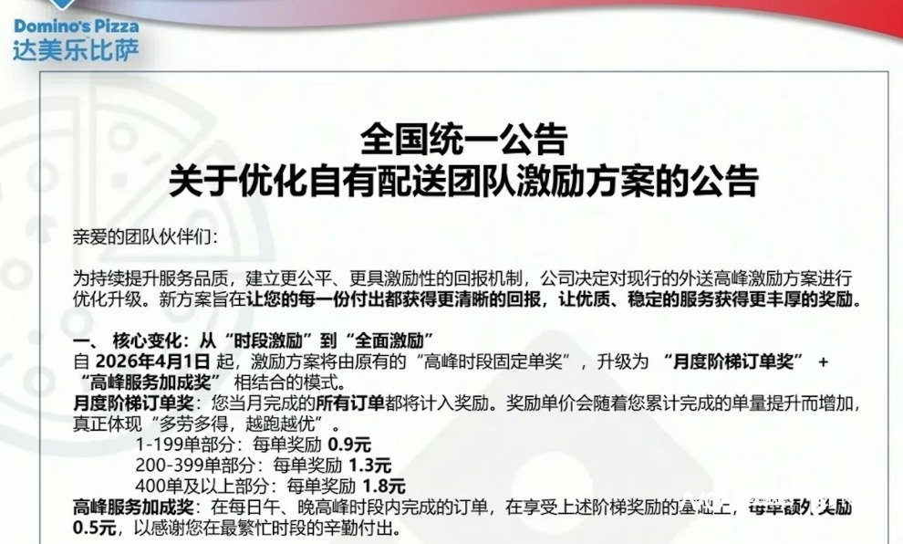 根据达美乐发布的《全国统一公告——关于优化自由行配送团队激励方案的公告》,自4月1日起,骑手的外送激励方案将由原有的“高峰时段固定单奖”更改为“月度阶梯订单奖”+“高峰服务加成奖”相结合的模式。骑手当月完成的所有订单都将计入奖励。奖励单价会随着骑手累计完成的单量提升而增加。