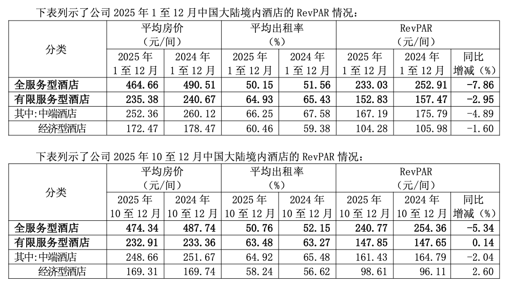 从住宿行业指标来看,2025年,锦江酒店全服务型酒店ADR(日均房价)为464.66元,同比下降5.27%;平均出租率为50.15%,同比减少1.41个百分点;RevPAR(可出租客房收入)为233.03元,同比下降7.86%。有限服务型酒店ADR为235.38元,同比下降2.2%;平均出租率为64.93%,同比减少0.5个百分点;RevPAR为157.47元,同比下降2.95%。