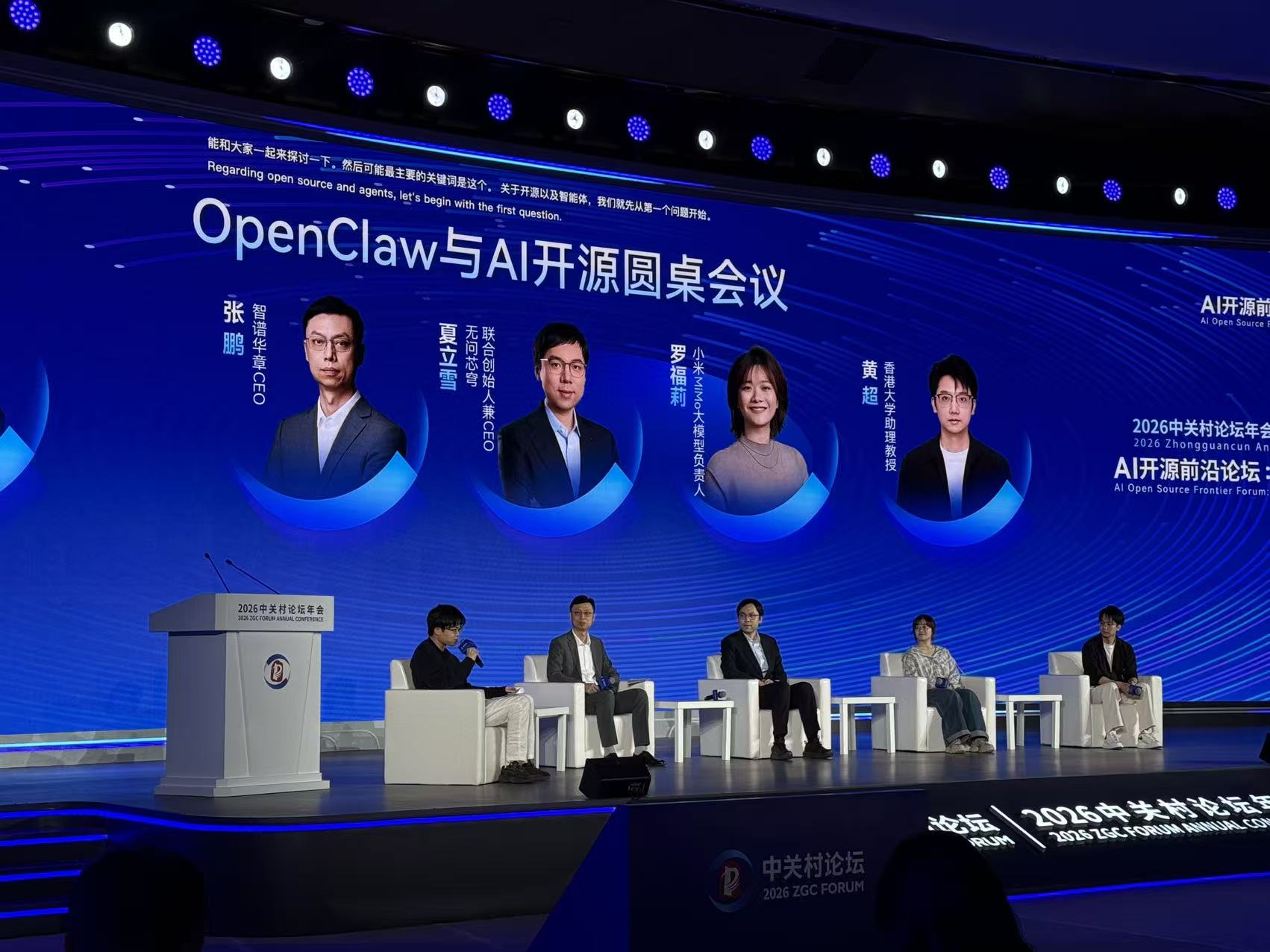 这场圆桌由月之暗面创始人杨植麟担任主持,智谱华章CEO张鹏、无问芯穹联合创始人兼 CEO夏立雪、小米MiMo大模型负责人罗福莉,以及香港大学助理教授、博士生导师、Nanobot团队负责人黄超共同参与。