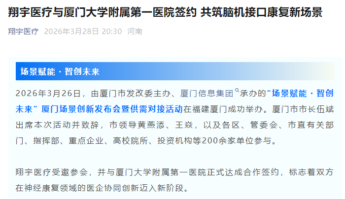 每经AI快讯,3月28日,据翔宇医疗消息,近日,翔宇医疗与厦门大学附属第一医院签署合作协议,共同启动“面向脑机接口的非侵入式脑卒中患者康复场景构建及评估”项目。该项目将聚焦脑卒中后神经功能障碍康复的核心需求,推动脑机接口康复技术的临床验证与普及,助力更多脑卒中患者通过“意念驱动”的精准康复训练恢复神经功能,重获生活自理能力。