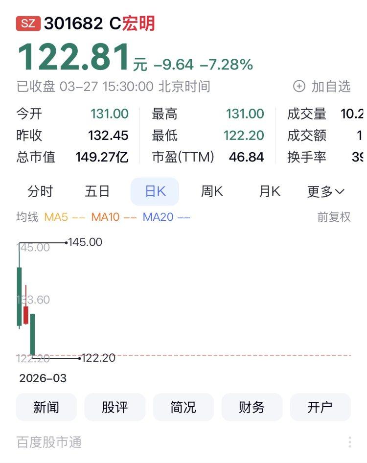 今年3月25日上市的新股宏明电子报收122.81元,日涨幅-7.28%,换手率39.85%,周涨幅-12.37%,今年以来涨幅-12.37%。