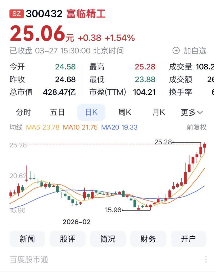富临精工报收25.06元,日涨幅1.54%,换手率6.40%,周涨幅18.04%,今年以来涨幅50.06%。