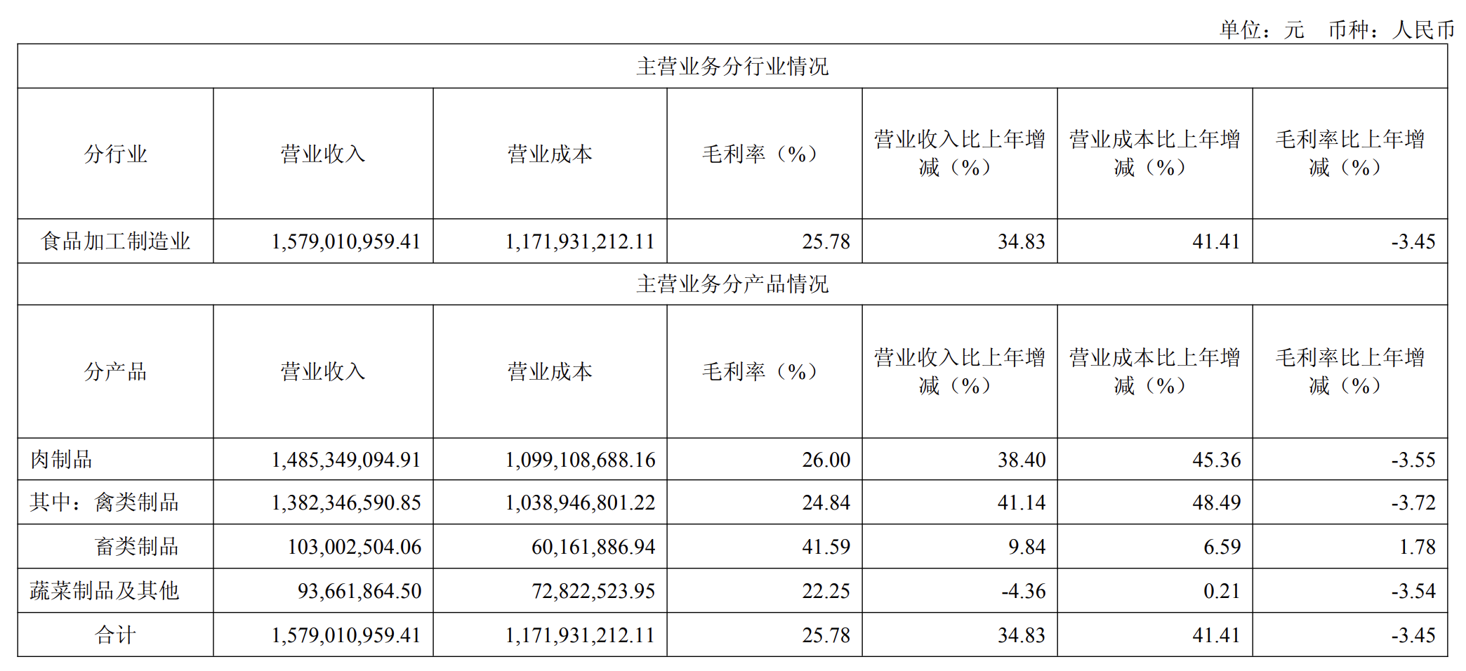 分行业来看,有友食品营收基本来自食品加工制造业,期内收入15.79亿元,毛利率下滑3.45%。分产品来看,公司肉制品毛利率下滑3.55%,其中禽类制品下滑3.72%,畜类制品增长1.78%;蔬菜制品及其他产品毛利率下滑3.54%。