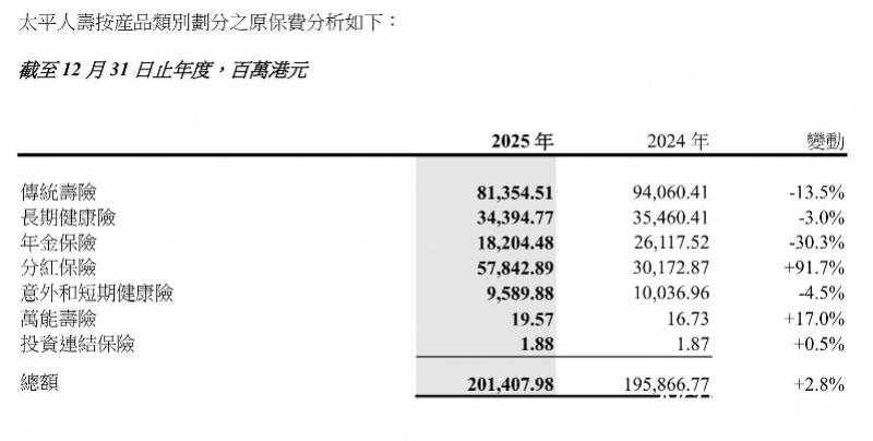 近日,中国太平保险控股有限公司(以下简称“中国太平”)发布2025年全年业绩。在集团主要业务板块普遍实现溢利大幅增长的背景下,核心子公司太平人寿交出了一份“有喜有忧”的成绩单:2025年实现原保费收入2014.08亿港元,同比增长2.8%(若以人民币口径计算,同比增长3.4%)。其中,分红险转型成效显著,分红险保费收入占总保费比重近三成,占长险首年期缴保费比重高达86.1%。
