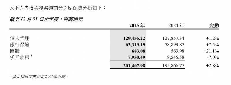 分渠道来看,个人代理渠道保费收入为1294.55亿港元,同比增长1.2%;银保渠道保费收入为633.19亿港元,同比增长7.5%;团体渠道保费收入为6.83亿港元,同比增长21.1%;多元销售渠道保费收入为79.50亿港元,同比下降7%。
