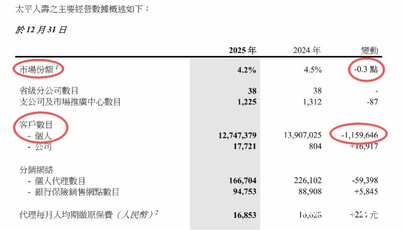 值得注意的是,2025年人身险行业整体增长强劲。行业数据显示,2025年我国人身险原保费收入为4.36万亿元,同比增长8.9%。有业内人士分析指出,太平人寿的保费增速显著低于行业平均水平,“慢于行业”或许是其市场份额下滑的直接原因。与此同时,个人客户基数的收缩进一步削弱了保费增长的潜力。