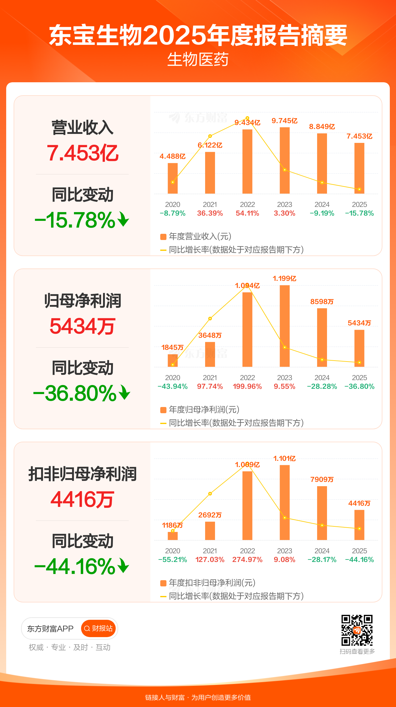 东宝生物3月30日发布2025年年报显示,公司全年实现营业收入7.45亿元,同比下滑15.78%;归母净利润5433.73万元,同比下滑36.80%;扣非归母净利润4416.15万元,同比下滑44.16%。