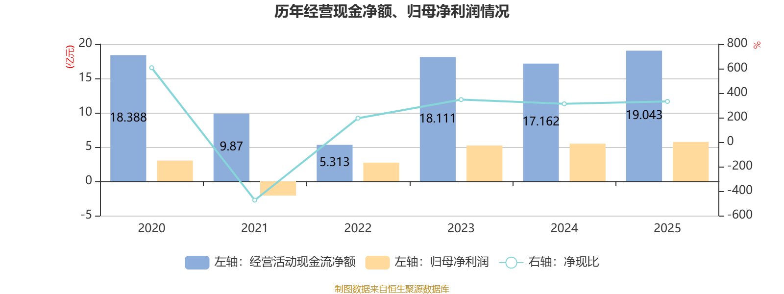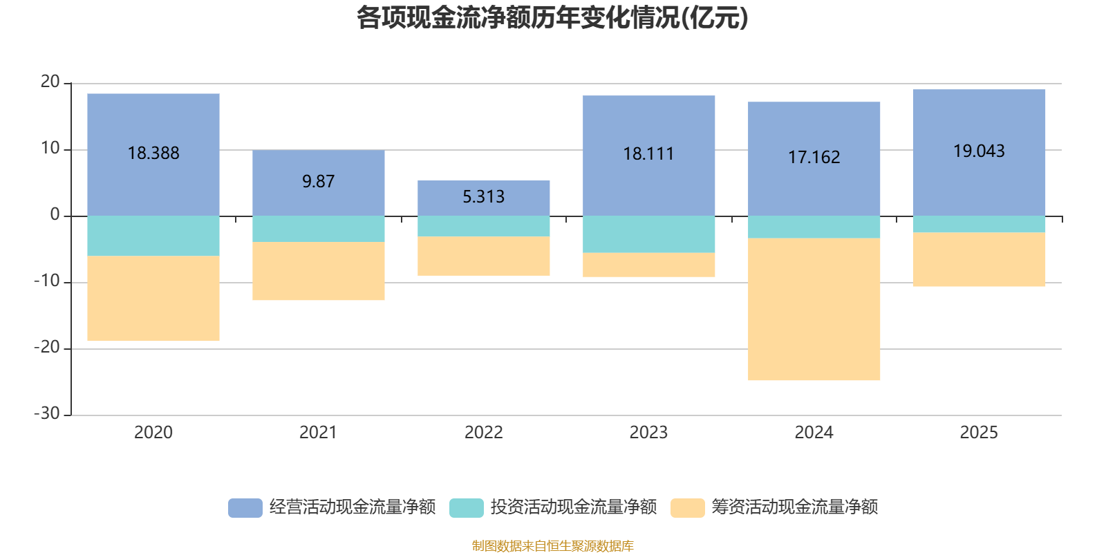 2025年,公司经营活动现金流净额为19.04亿元,同比增长10.96%;筹资活动现金流净额-8.12亿元,同比增加13.28亿元;投资活动现金流净额-2.56亿元,上年同期为-3.41亿元。