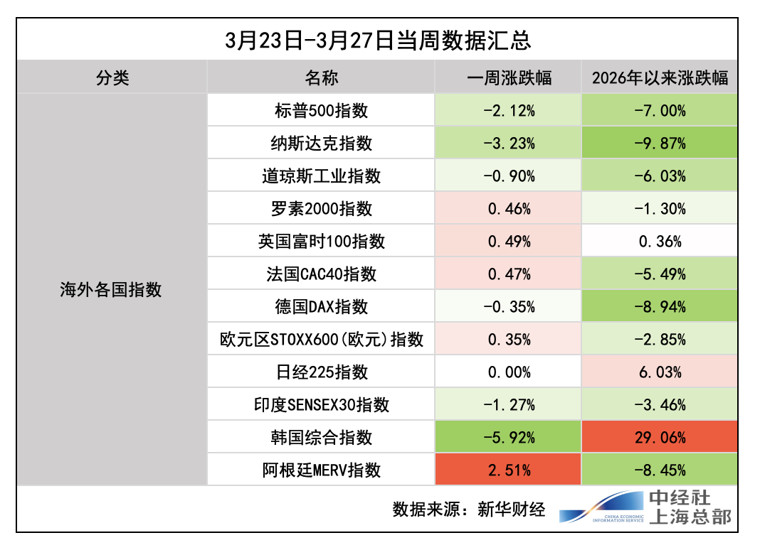 欧洲股市方面,欧洲各国股市涨跌不一,欧洲STOXX 600指数本周累计上涨0.35%,德国DAX 30指数收报22300.75点,本周累计下跌0.35%;法国CAC 40指数收报7701.95点,本周累涨0.47%;英国富时100指数收报9967.35点,本周累涨0.49%。