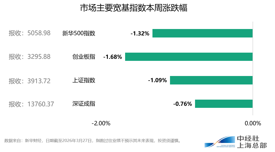 本周(3月23日至3月27日)A股市场主要宽基指数先抑后扬。其中,上证指数周度下跌1.09%,深证成指周度下跌0.76%,创业板指周度下跌1.68%,新华500指数周度下跌1.32%。新华500指数本周探底回升,开盘报5046.12点,至27日收盘报5058.98点,全周振幅3.6%,成交额为3.81万亿元。
