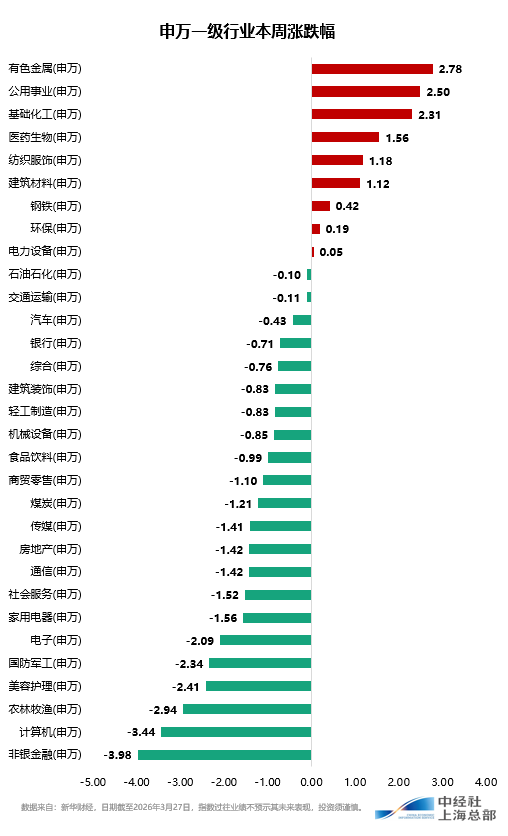从申万一级行业来看,本周行业指数涨少跌多,有色金属、公用事业、基础化工等行业指数涨幅居前,非银金融、计算机、农林牧渔等行业指数跌幅较大。