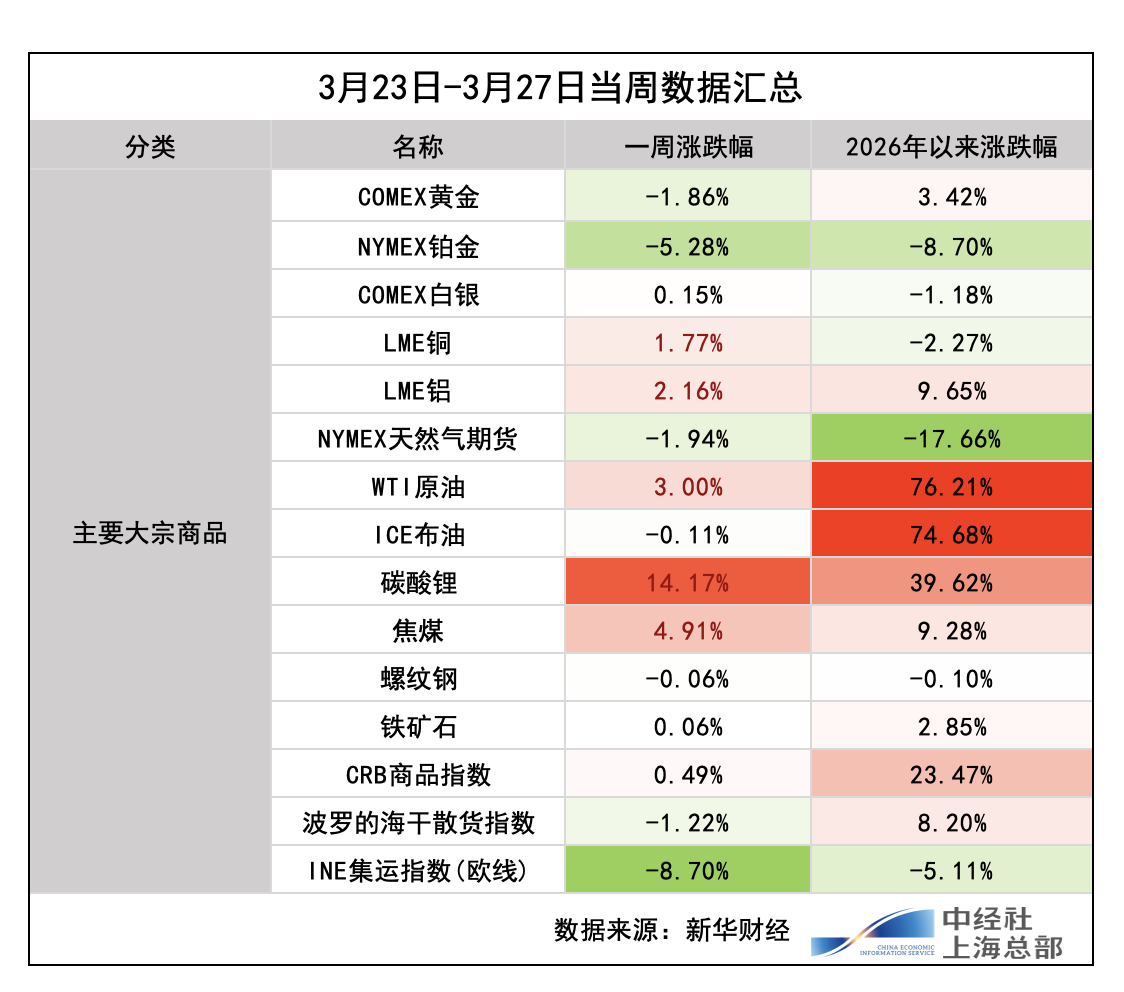周初因地缘风险缓和预期大幅下跌并录得九连跌,现货黄金本周收于每盎司4493.35美元/盎司,COMEX黄金本周收于每盎司4489.7美元,全周累计下跌1.86%。现货白银本周收于69.72美元/盎司,COMEX白银收于69.77,全周累计上涨0.15%。